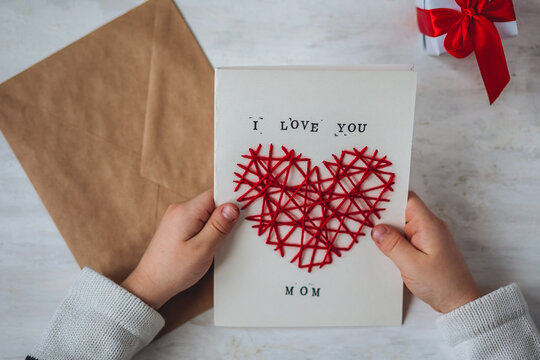 Concept of children craft, handmade gift for Mother's Day. Little boy holding craft card with embroidering in the shape of heart and printed message I love you Mom. Kid's leisure activity, handcraft