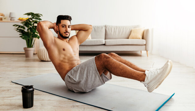 A fit man performs sit-ups on a mat in a well-lit living room. The space has a couch and indoor plants, creating a motivating environment for his workout session.