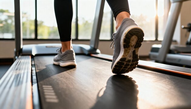 Close up of person walking on treadmill in gym. Fitness, exercise, and healthy lifestyle.