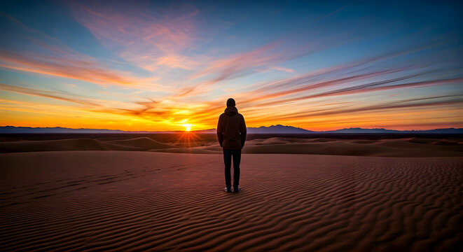 A solitary figure stands on vast desert dunes watching a breathtaking sunset this image inspires reflection and adventure perfect for travel blogs and motivational content