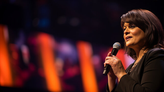 Professional speaker giving a talk at a conference, audience in soft focus. Public speaking concept. Generative AI