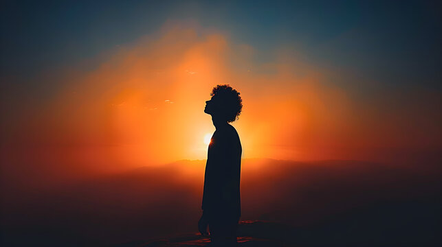 Silhouette of a person overlooking clouds at sunset for blogs, websites, motivational content, travel guides, nature-themed designs, presentations, and digital art projects