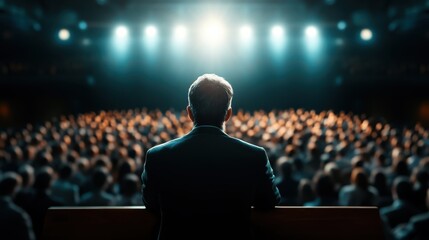 A powerful scene capturing a speaker facing a large audience in a theater, illuminated by bright lights, portraying inspiration, influence, and the art of public speaking.