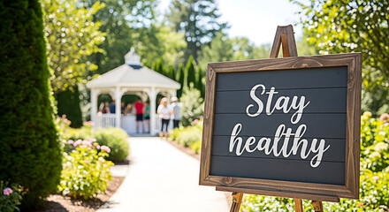 Stay healthy sign in a garden setting with a gazebo promoting wellness and outdoor activities perfect for health campaigns garden events and motivational content for a healthy lifestyle