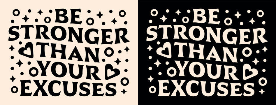 Be stronger than your excuses lettering women motivation for working out. Personal development gym girl cute groovy retro aesthetic discipline growth mindset quotes for shirt clothing poster vector.