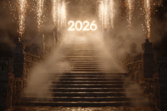 Staircase leading up to glowing 2026 in minimalist motivational concept