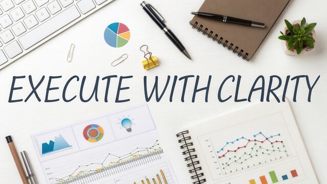 Professional workspace featuring charts, stationery, and motivational quote promoting clarity in execution strategies