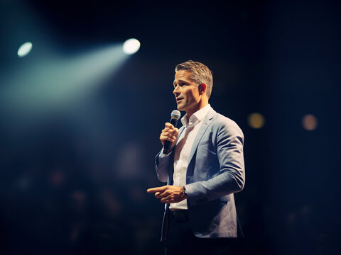Generative AI composition image Exited motivational speaker on stage Diversity Success Leadership concept performance