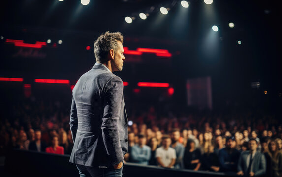 Back view of motivational speaker standing on stage in front of audience speaking to crowd for motivation speech on conference or business event