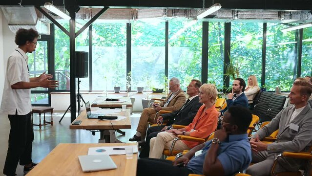 Video of a business conference meeting with an educator speaking to the people in the room. Cinematic footage representation of public speaking concepts and self improvement motivational summits