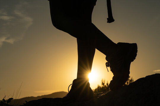 Silhouette of the legs of a woman doing trekking in the mountain with the sun creating a sunstar with her foot at sunset