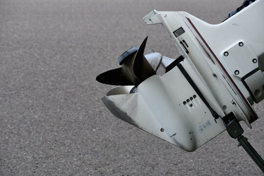 Outboard boat motor with no branding. Small propeller, white body.