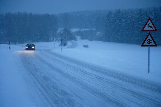 Car driving on snowy road in Moerlbach Bavaria with forest and traffic sign