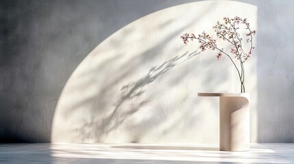 A minimalist composition featuring delicate branches in a vase on a modern pedestal, with dappled sunlight and shadows cast on a textured wall.