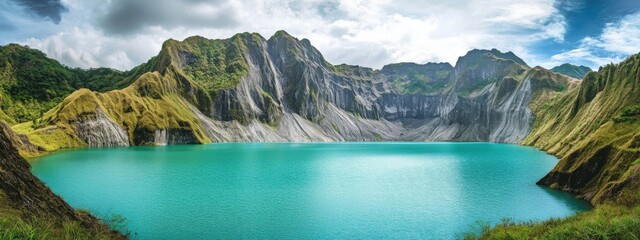 An extraordinary shot of the volcanic crater lake of Mount Pinatubo in the Philippines, with its turquoise waters surrounded by steep, rugged cliffs