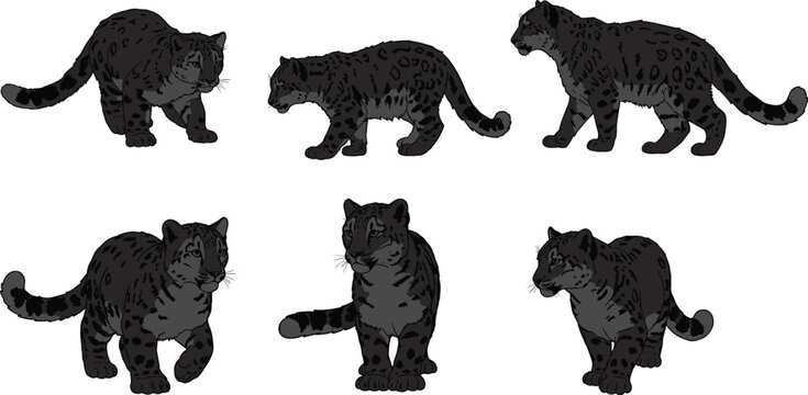 Snow leopard illustration set, wild animal in various poses, wildlife art, endangered species, nature conservation, big cat and mountain predator