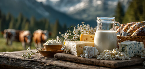 group of milker cows at alpine pasture Niederhorn mountain, with view to bernese alps and glacier