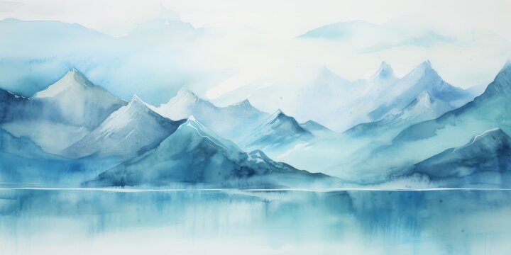 Icy Winter Snowy Mountain Landscape Watercolor Painting with Lake and Clouds - Wall Art - Poster - Printable - Print - Wallpaper - Background - Artwork