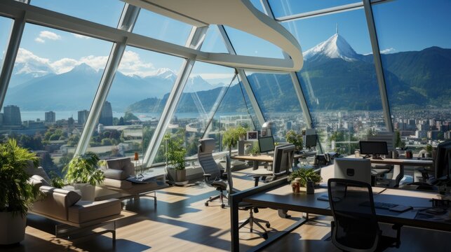 Modern open office space windows with great city and mountain views