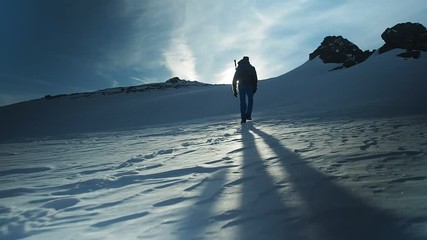 Hiker with backpack climbing top of mountain, mountaineering concept. Man walking snow, hiking in winter. Trekking adventure, people in nature concept. Epic sunset view snow mountain landscape,