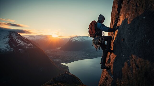 climber climbs the big rock, high mountains lofoten island, hiper northen light, midnight sun