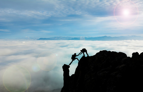 Hikers Joined By Safety Line In Snowy Mountains