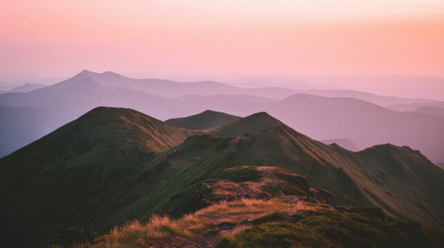 Serene mountainous landscape bathed in soft pink hues during sunrise or sunset,