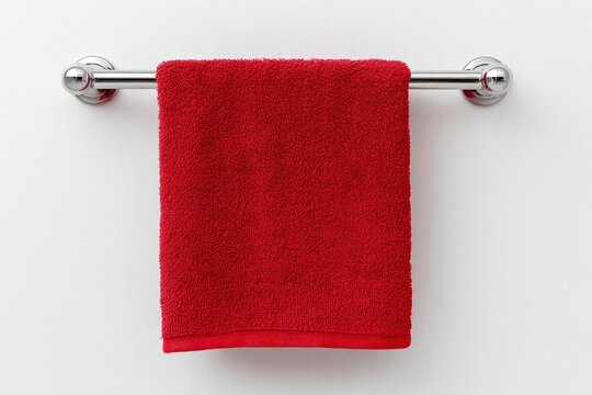 A red towel hangs on a silver towel rack against a white wall