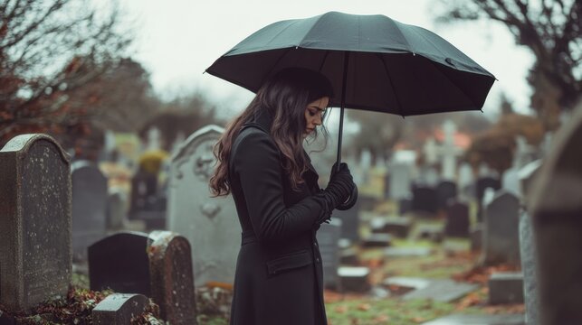 Solemn Woman with Umbrella Mourning at Cemetery on Overcast Day