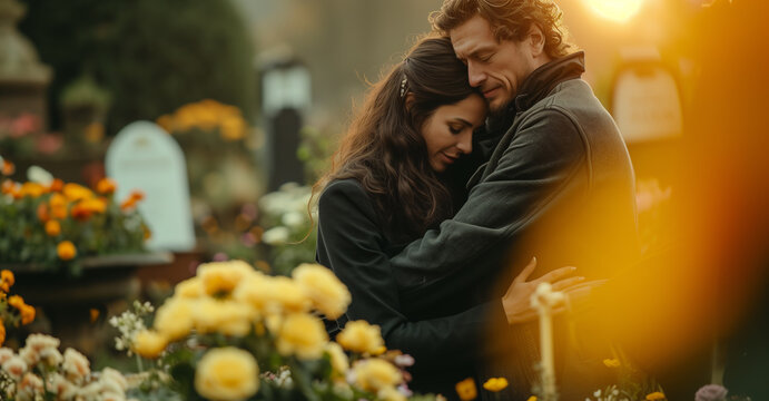A solemn gathering of people at a funeral service in a cemetery during autumn, with sunlight filtering through trees.