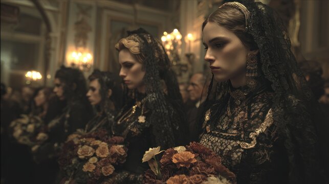 Person places floral arrangement on polished wooden coffin during solemn funeral service. Close-up shot focuses on hands arranging flowers, conveying grief, loss, remembrance. Scene captures