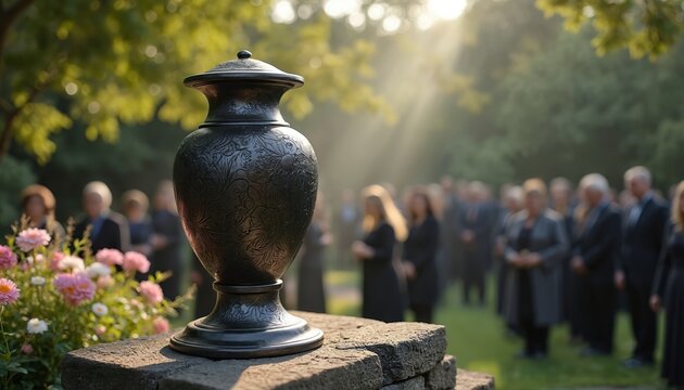 Funeral urn sits on stone pedestal at outdoor memorial service. Mourners in black attire stand solemnly in garden. Flowers bloom nearby, sunlight streams through trees.