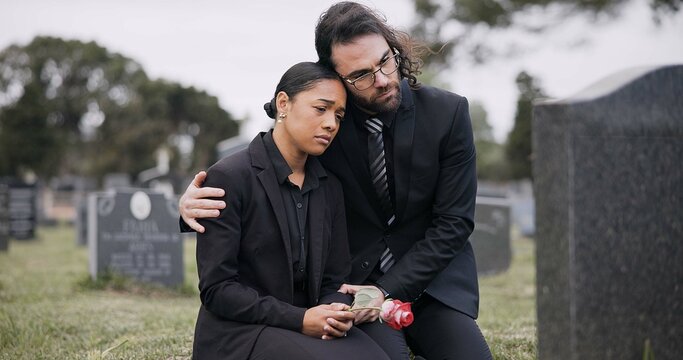 Sad couple, rose and graveyard in loss, grief or mourning at funeral, tombstone or cemetery. Man and woman hug with flower in depression, death or goodbye at memorial or burial service for loved one