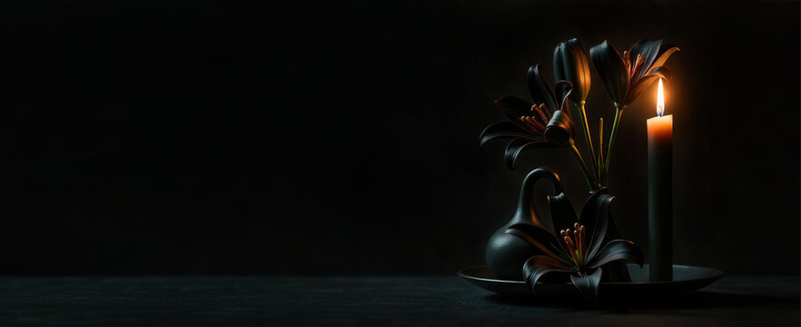 Condolence card template with black lily burning candle on black background with empty space for text. Funeral service business card mockup design. Memorial day banner with copy space. Mourning death.