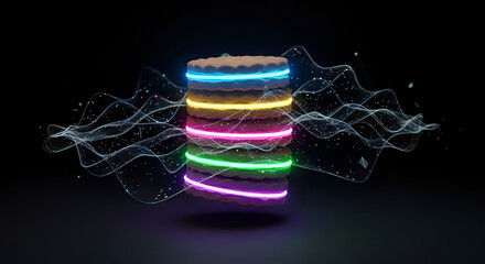 Delicious, brightly glowing cookie stack with energy waves for a modern, futuristic dessert or snack concept that will grab attention and make mouths water!