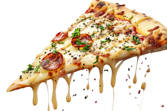 Mouth-watering slice of pizza oozing with cheese, bacon, and herbs, perfect for food enthusiasts and culinary visuals.