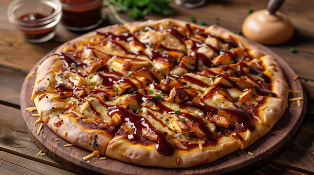 A mouth watering fast food BBQ chicken pizza topping