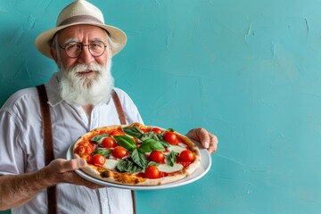 Senior man savoring pizza on pastel backdrop, providing ample space for text placement