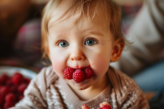 A close-up portrait of a baby girl blowing raspberries with a mouthful of raspberries A baby blowing raspberries and making funny faces