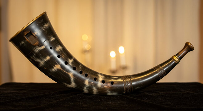 Close up of a horn instrument with holes and a mouthpiece on a dark surface with candles behind it