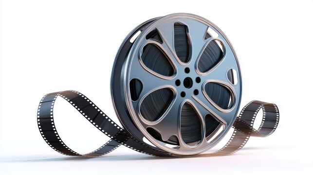 A film reel is placed on a white background. The reel holds a black and white film strip that curves around it. This setup highlights classic cinema tools used for movie creation.
