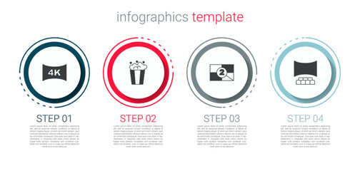 Set Screen tv with 4k, Popcorn in cardboard box, Old film movie countdown frame and Cinema auditorium screen. Business infographic template. Vector