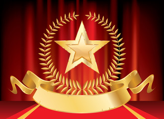 Best company of the year 2025 award with spotlight and curtains background. Best Award gold laurel wreath badge logo design tree star vector illustration isolated on different backgrounds.