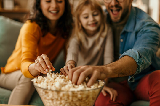 Parents and daughters enjoy quality time on the couch. They laugh and wave at the tablet camera while having a friendly conversation with people close to their hearts.