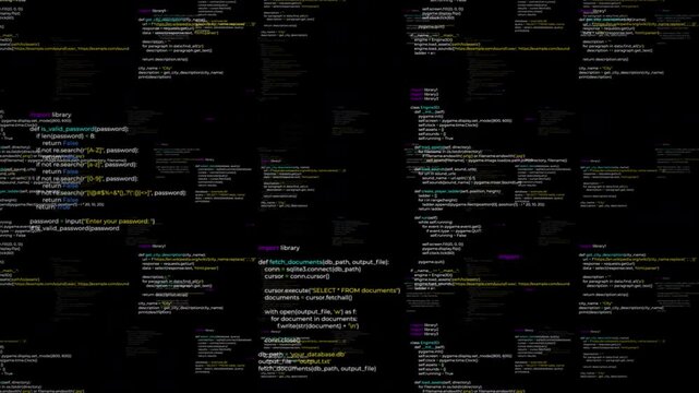 Green Blocks of abstract program code are written and moved in the virtual space. Data flow animation. IT, software development and hacking concept. encrypted security code