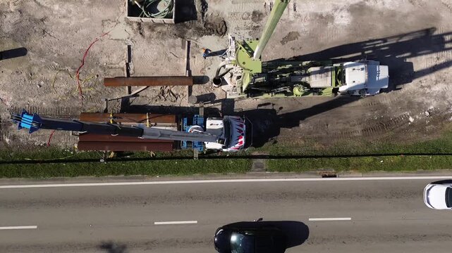 Aerial view of road construction repair site with working cranes next to moving railway system on a sunny day