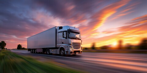 Semi-truck is moving fast on the highway with a background of colorful sky and blur motion effect, concept for distribution solutions, cargo industry and logistic services