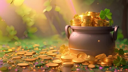 Saint Patrick s Day. Pot full of golden coins with rainbow .Traditional Irish symbol of success and luck. Leprechaun s gold. Celebrative, festive 3D Render concept sparkling lights moving around