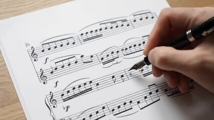 A close-up of a composer's hand writing musical notes with a fountain pen on sheet music, a concept for creation and classical music.