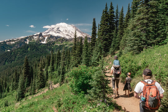 Young women hiking with kids toward Mt Rainier on the Naches Peak Loop Trail in Mt. Rainier National Park